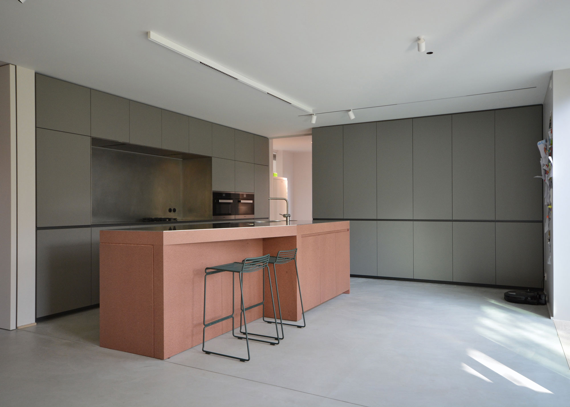 Keuken met tablet en kooknis in inox, deurtjes in structuurlak 2.