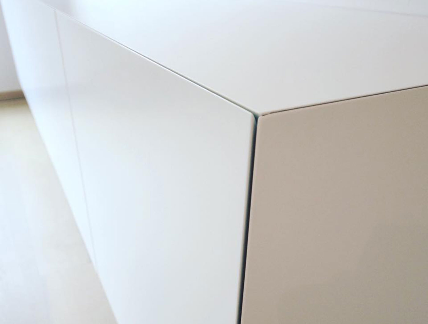 Zwevend meubel in zijdeglans met zwarte schuiven, deuren en fronten in verstek.